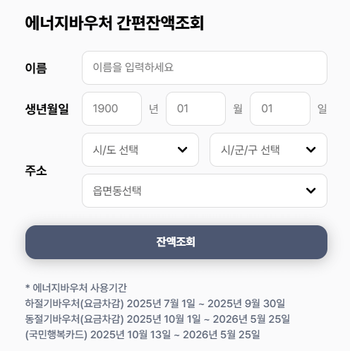 - 잔액 조회: 에너지바우처 공식 홈페이지(www.energyv.or.kr)에서 성명, 생년월일, 주소를 입력하여 잔액을 확인할 수 있습니다.